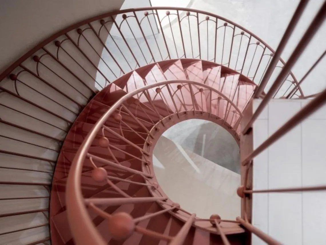 Whilst the palette focuses heavily on monochrome, blush pink paint on the pipes and stairways is expertly used as an accent colour. A variety in texture, shape and height creates an illusion of movement in the room.