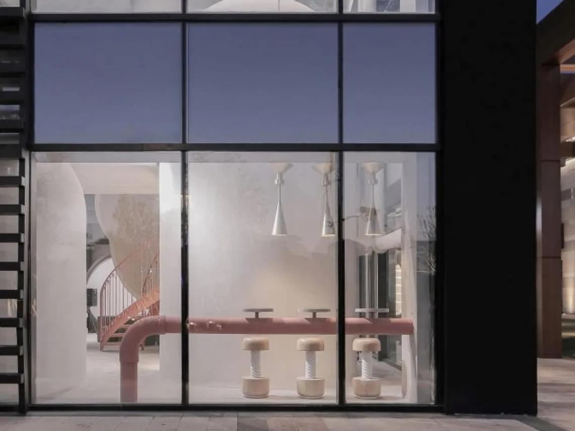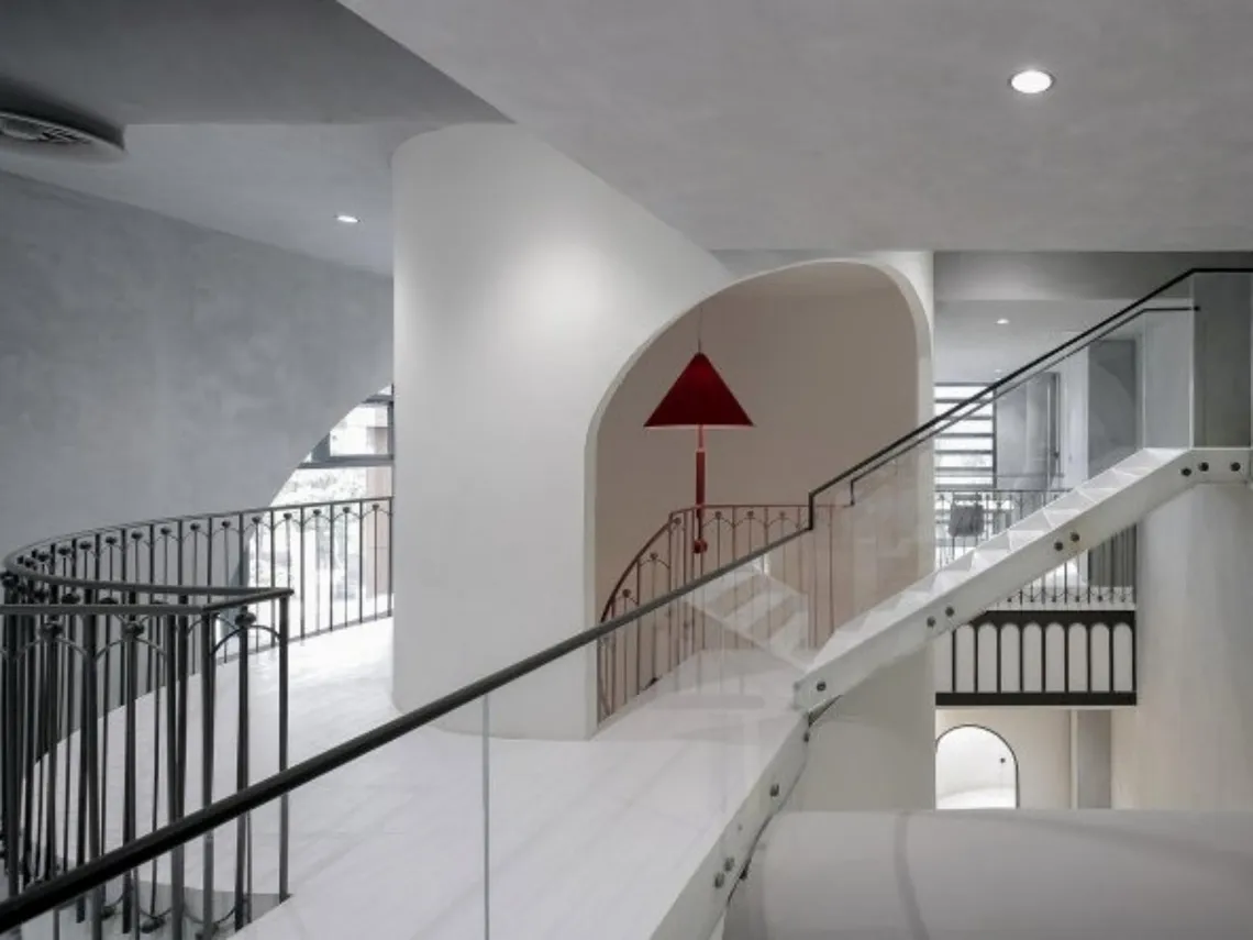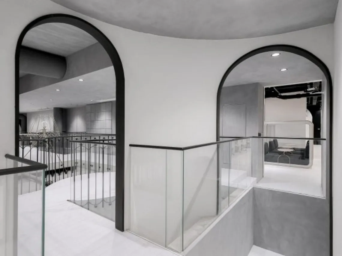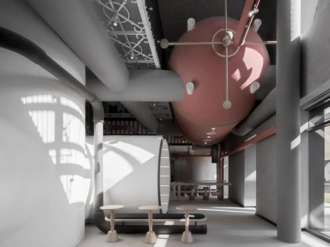 A fascinating approach to minimalism in a collaborative tech hub in Shanghai, through monochrome and pink, exposed pipework and contemporary staircases.