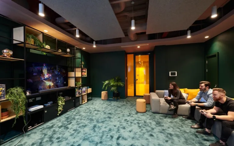 Working closely with Unity, M Moser designed a bespoke, four-story workspace that creates compelling experiences for work and socialization throughout. Front of house features a tech suite with a virtual reality lounge, games room, training area, large boardroom, and video conferencing room. Communal social and refreshment areas on each floor function as informal breakout spaces to encourage mingling.