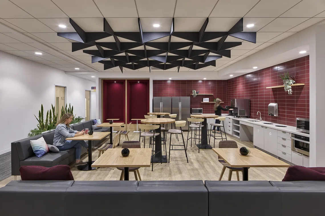 When the design firm Jacobs were tasked to build an open-plan workplace for a major financial services company in Westlake, Texas, they knew that employees would need touchdown spaces where they could be fully focussed and alone. So they installed some of our Portals booths, upholstered on three sides, to give much-needed acoustic privacy without becoming totally disconnected from the buzz of the office. They also installed desks with sit-stand functionality; offering standing desks and other kinds of ergonomic workstations, and installing appropriate lighting, does a lot to reduce stress levels. Installing dynamic lockers for storage also helps by giving staff their own space where they can store their possessions.