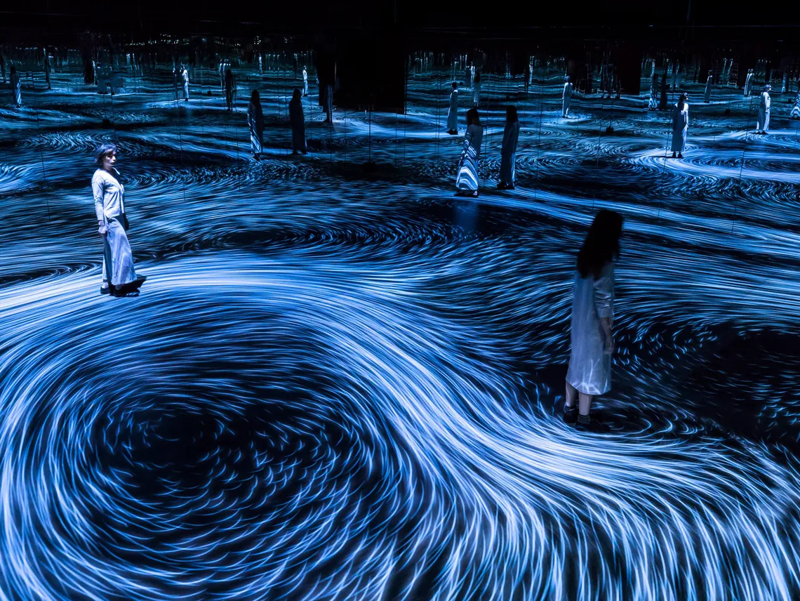 Another approach is favoured by Japanese digital art collective TeamLab. In 2018, they installed stunning whirlpools of light in both the National Gallery of Victoria, Melbourne, and the inaugural show at the Amos Rex museum, Helsinki. By using projection-mapping techniques and responsive lighting, they’re able to send what looks like water flowing up a building’s walls or down into its floors. And, again, through the use of motion sensors their installations can react to visitors walking through them in real time. TeamLab’s practice is about building beautiful digital landscapes: other recent projects have included projected waterfalls, koi carp ponds and moving forests full of blossoming flowers and butterflies that flap around the audience.
