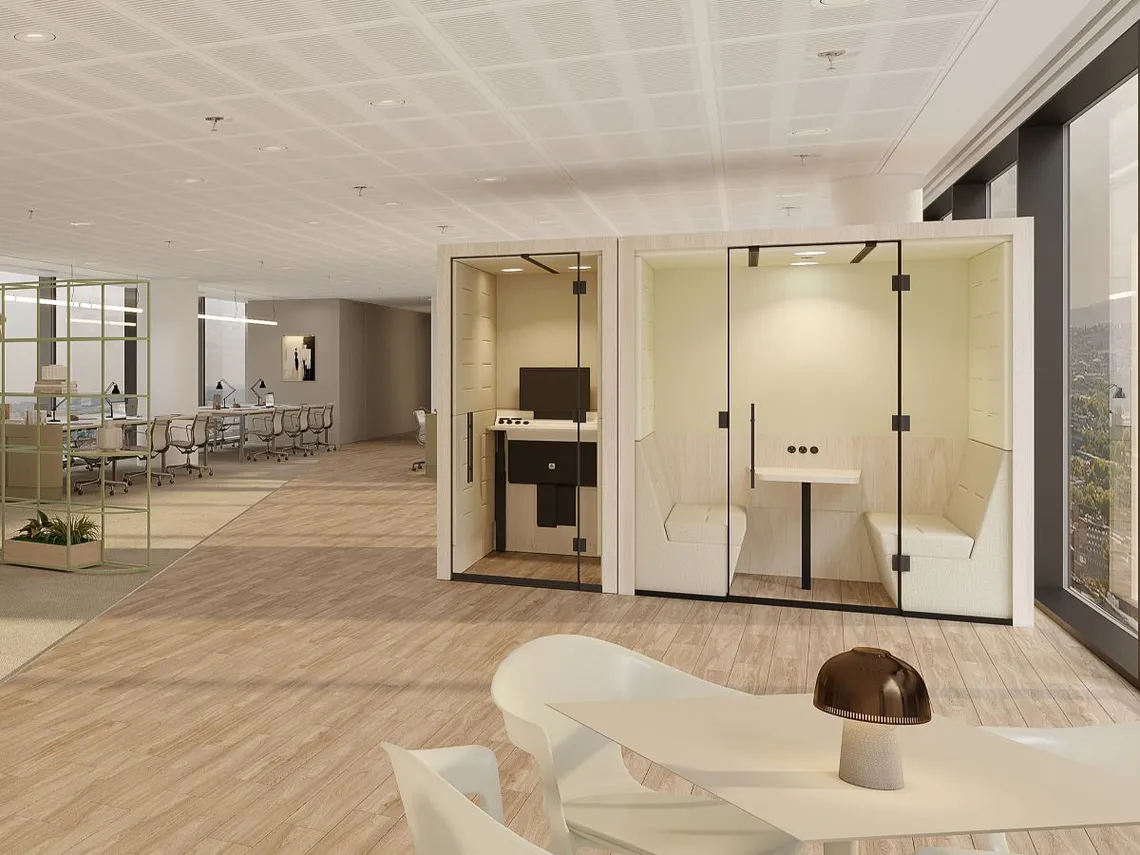 Plug-and-play, with integrated power, screen and charging options, Portals Connect can be customized with a huge range of cladding and upholstery options, allowing it to blend and become part of any design scheme. Step-free access, acoustic protection and adjustable lighting supports greater accessibility and contributes towards making the workplace easier to navigate for today’s diverse workforce.