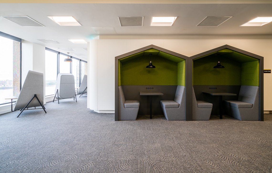 On a optimistic, energising backdrop of yellow, Railway Carriages in a stately green and grey, populate the space, providing employees with sites for impromptu meetings and catch ups. This is something which is critically necessary in the back-to-work era when face-to-face social interaction is experiencing a resurgence. Employees need to experience the benefits of being back in the office and undoubtably, networking, and social relationships are a major factor in creating a culture which has people returning again and again.
