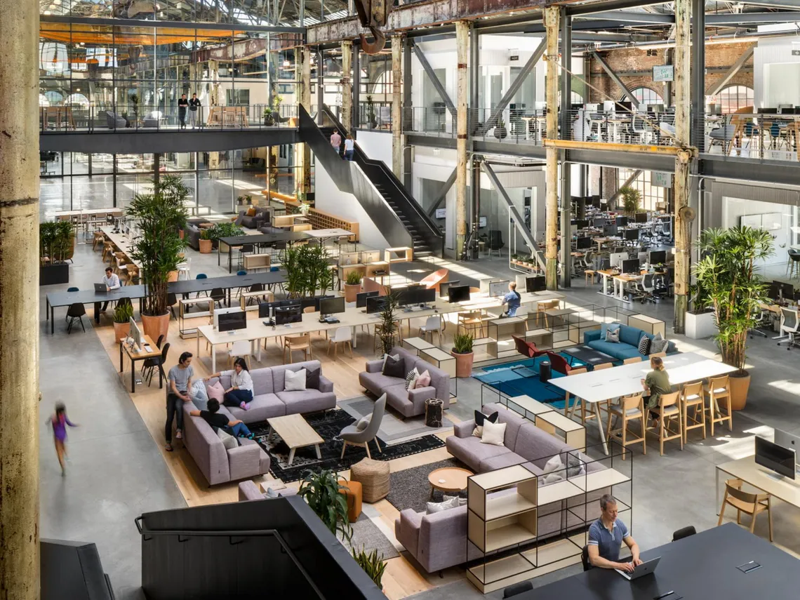 In the words of Gensler’s design manager Marcus Hopper, “This is basically a new building inside an old building.” Countless ships have been repaired in this 55,000 square-foot machine shop, going back to the days of the Spanish-American War of 1898, and Gensler decided to leave the old gantry cranes, lifts, pipes, beams and roofing as a visual focal point an also an homage to the past. In keeping with the building’s history, they designed the conference rooms to look like shipping containers; however, in keeping with the building’s bright future, these rooms have been named after some of Gusto’s 60,000 small business clients: the Bait and Tackle Shop, the Bakery, the Florist, the Gelateria, the Ramen Shop, and so on.