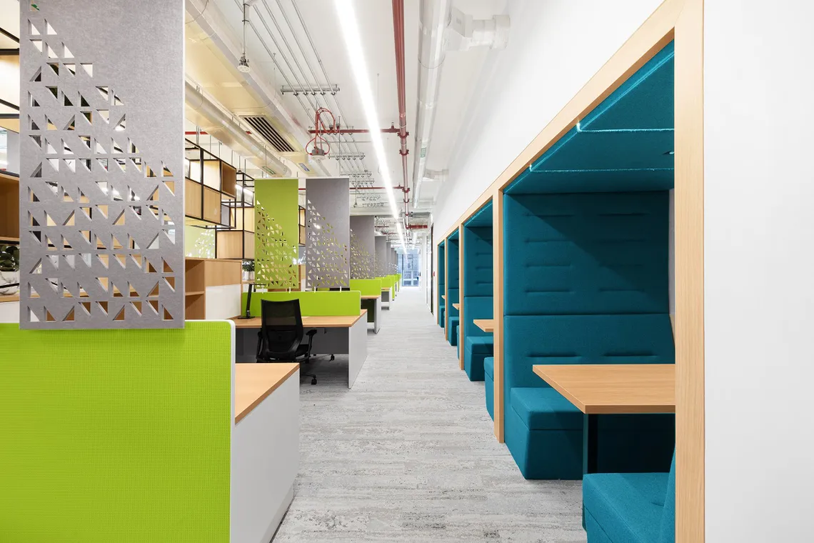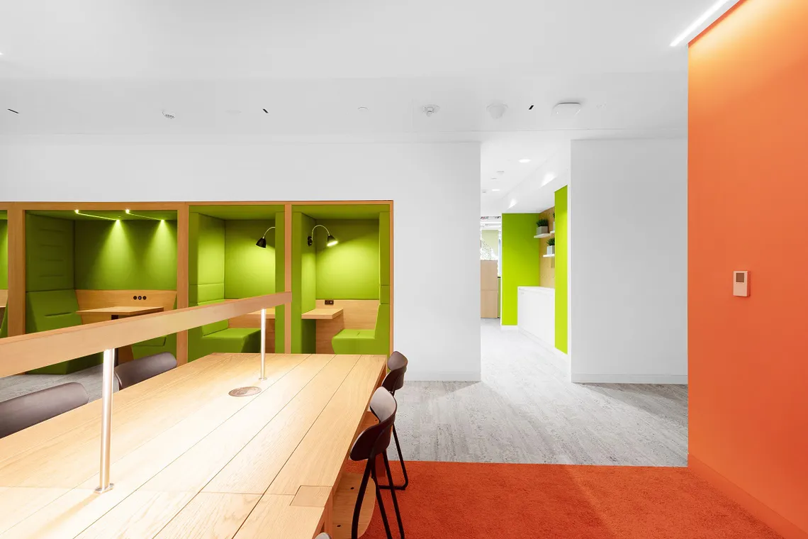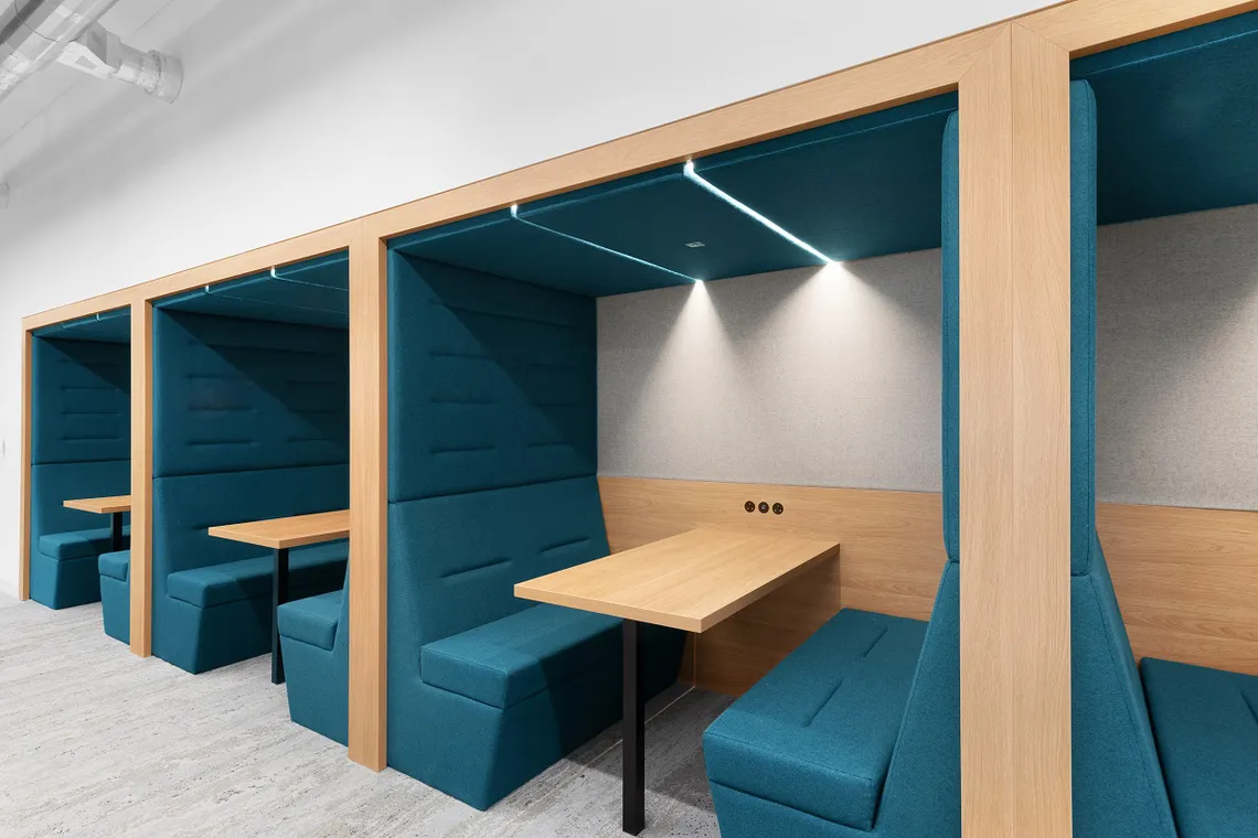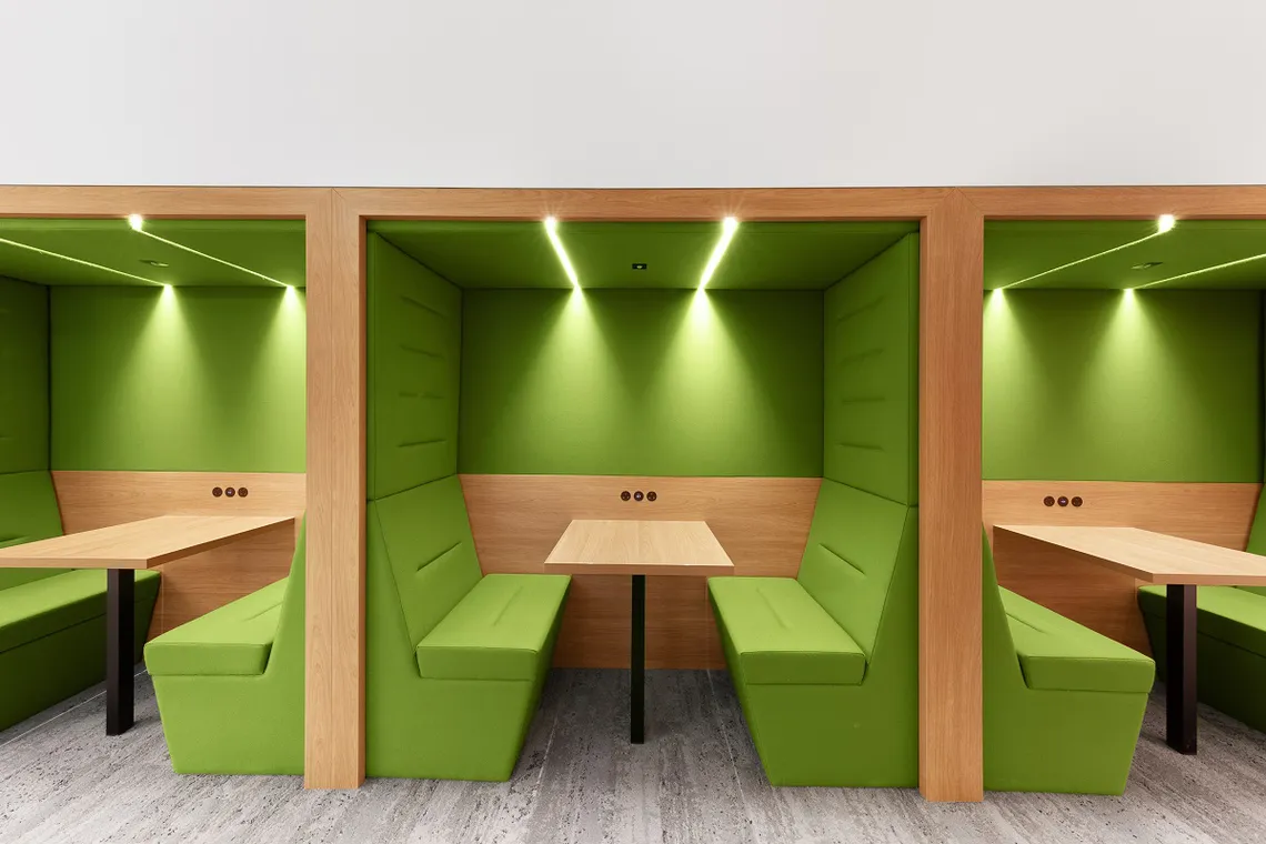 We were pleased to work with Khansaheb Interiors to provide twenty four Railway Carriage booths, across multiple levels of the Campus. Acting both as an ideas hub for collaboration as well as a relaxed, focus space for concentration, they provide hotspots for student interaction, wherever they are placed. With a plethora of finish options available, Khansaheb were able to customize the booths to ensure they complimented the theme and colour palette of each individual space they were set in. Fitted in alongside the Railway Carriages are their sister product, Portals. Providing a single person touchdown space for focused work or a breakout setting, the matching design aesthetic allows them to be seamlessly built-in alongside each other and provides the same level of design choice.