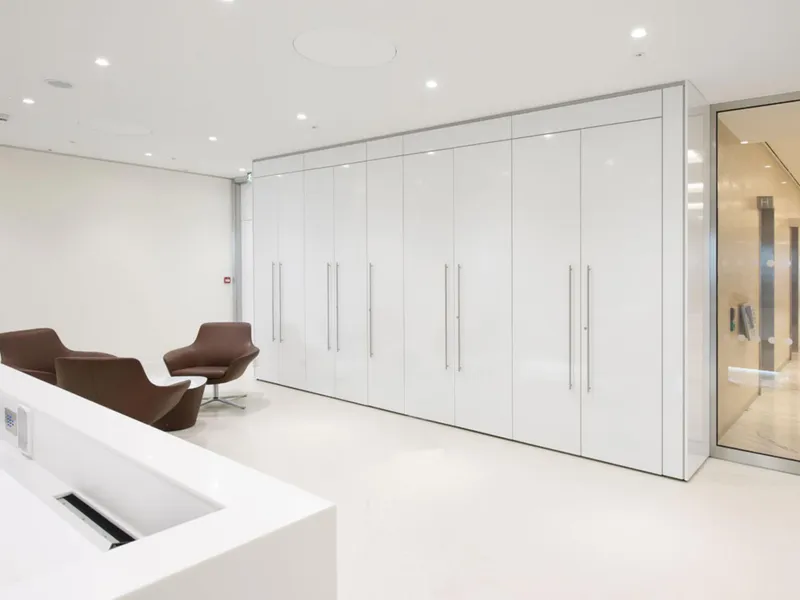 We were pleased to work with Habit Action to provide our Lockers to this design. Modular, customizable and highly adaptable, these lockers have become an extension of the O'Connor brand in their workspace, whilst also enhancing the employee experience, providing their staff with secure personal storage space. Up on the second floor, the executive business lounge and bar space provides an luxurious lounge with a full AV wall for employees to bring clients for social gatherings. Here our Signature Storagewall provides the much needed storage, whilst it's modular nature makes it much more easily customizable, its built-in look complements the bespoke feel of the space