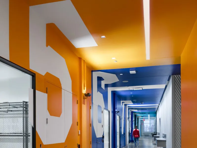 To nurture creativity and innovation the design takes inspiration from sports, speed, and creator culture. Stadium light fixtures illuminate the showroom corridors, with super-graphic wayfinding numbers recalling arena signage. The central elevator and service core is clad with corrugated metal panels, custom perforated for acoustic performance and set at the sixty-degree angle of the famous Three Stripes. The industrial language of the former factory is preserved and celebrated by up-lighting the masonry piers and exposing the high ceilings, keeping mechanical and other building systems carefully organized and coordinated. A palette of expanded metal, hot rolled steel, cast concrete, and vibrant site-specific art resonates with Adidas’ vision of authenticity and urbanity.
