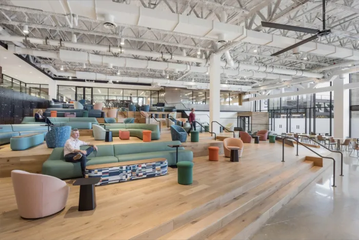 Employee health and well-being were also a high priority for Boston Dynamics. The headquarters provides physical activity opportunities, views to the outdoors, and daylighting throughout the entire workplace. Uniquely people-centric spaces such as the lobby’s “robot gallery,” the multi-leveled Town Hall space, the kitchens and dining spaces, fitness rooms, and mothers and quiet rooms were designed with hospitality in mind to give the workplace an invitingly casual and playful feel.