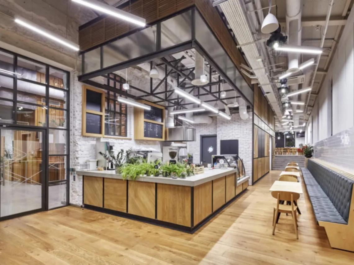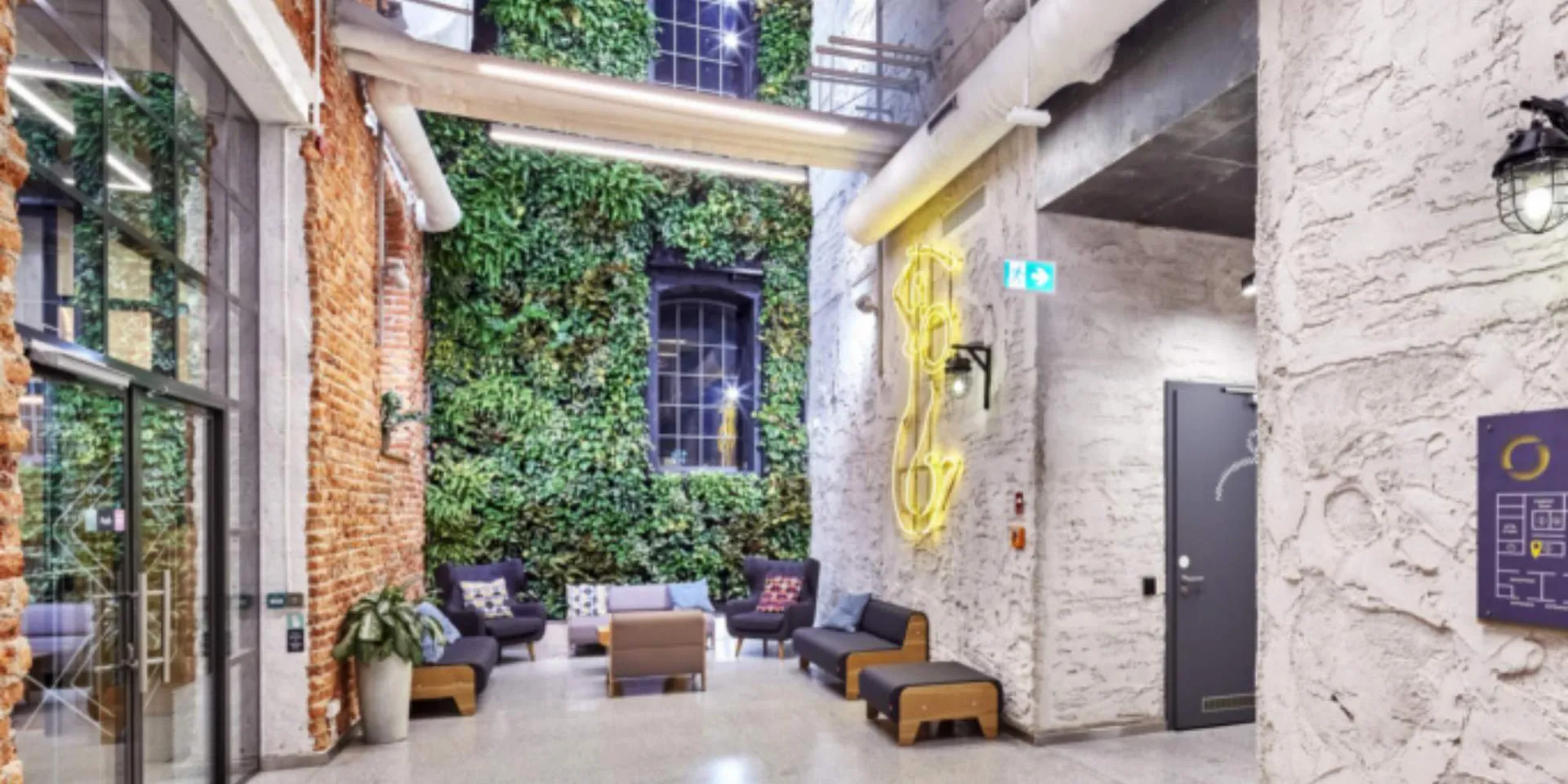 The main reception desk is composed of recycled wooden planks, and a decorative reception wall entailing a renovated switchboard of LED-illuminated control lights is a relic from the former vodka factory. Other design elements such as a 10 metre-high natural vertical garden, terrezzo flooring reminiscent of the one used in the 1950s and a large mermaid, the symbol of the city of Warsaw lit up on the wall of the atrium in bright neon lights transform this into an inspiring and nurturing workspace.