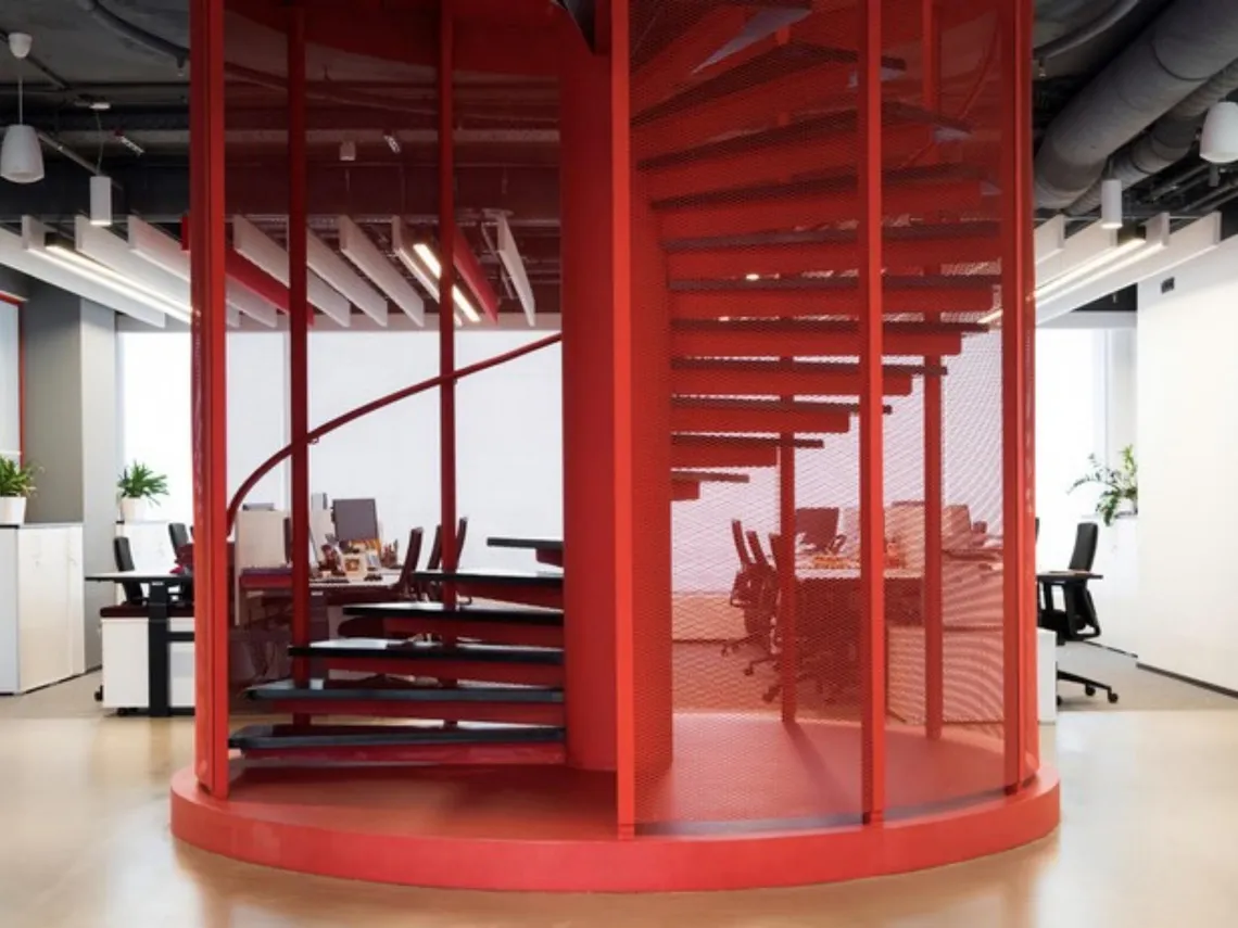 Two fire engine red staircases are the central office spine, ensuring a flow of communication and engagement between floors. Built using Hilti products, the stairs are a deafening statement at what Hilti equipment can do.