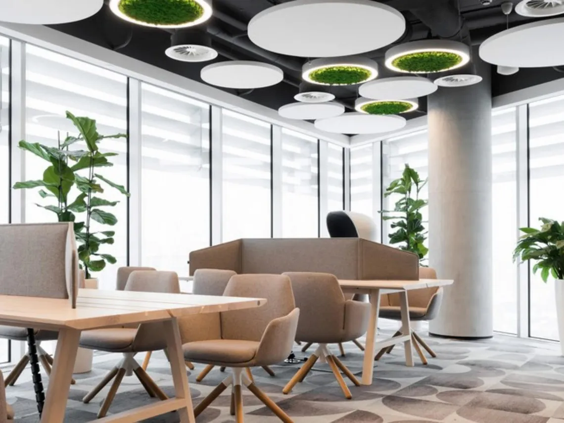 Whilst there are enclosed head offices dotted throughout the building, they are allowed to be shared by fellow employees and used as meeting rooms. In shared workspaces, biophilic touches have been used to bring nature in to an otherwise urban environment.