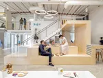 Custom designed wall joinery houses additional casual seating so when it's time for a meeting, employees can pull out a stool and take a seat. When they're done, the stools slot back into the wall for tidy storage.