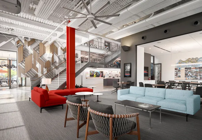The mid-landing of the stairs is a cantilevered extension of the mezzanine and houses a vast material resource library. Designers, creatives and guests can meet informally on the landing, within the main kitchen and break area, or enjoy the new outdoor roof terrace overlooking the recently renovated Horton Plaza Park.
