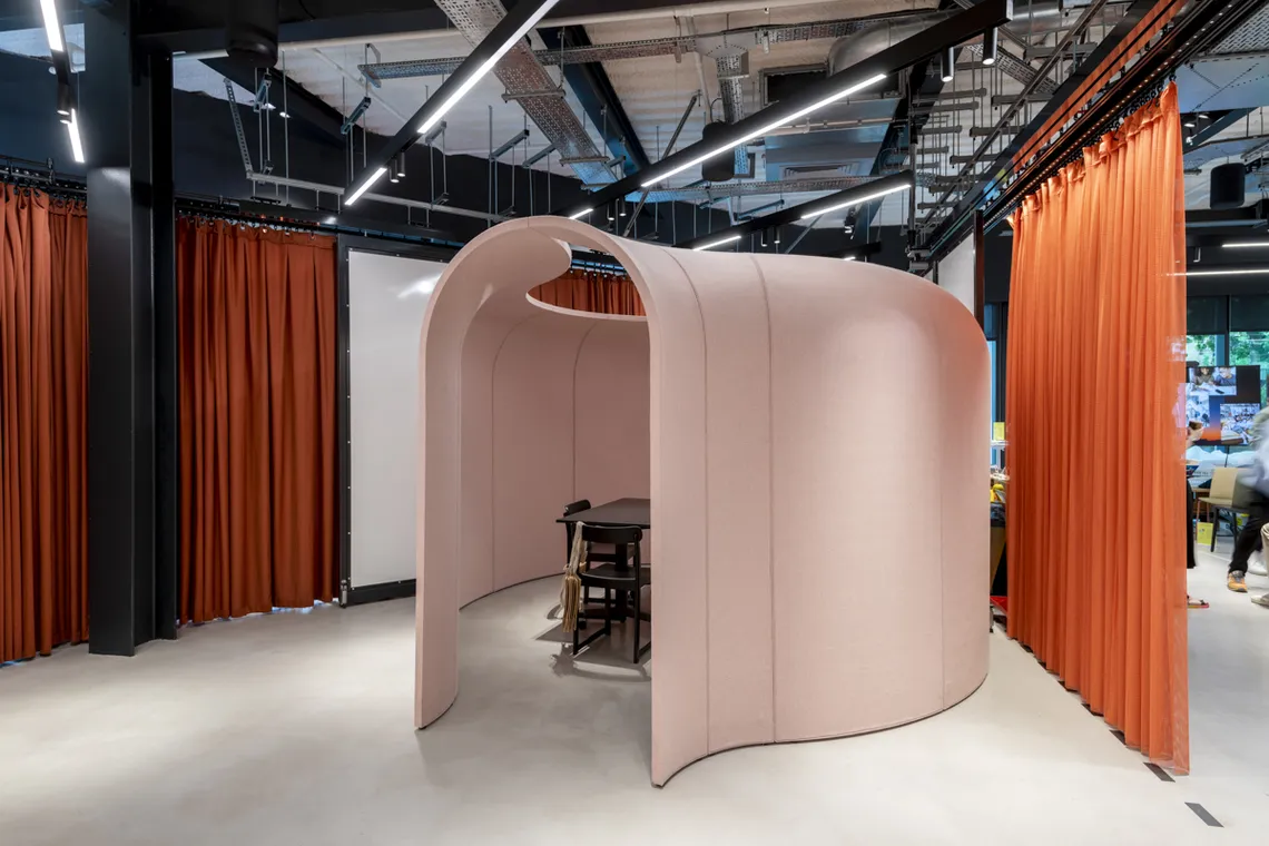 The comfort acoustics and serene environment are particularly beneficial for workplaces aiming to design for neurodivergence, accommodating employees with different sensory needs. Dark fabrics can be used to create deeper, more subdued spaces, shielding users from harsh fluorescent lighting and offering a retreat for the senses.
