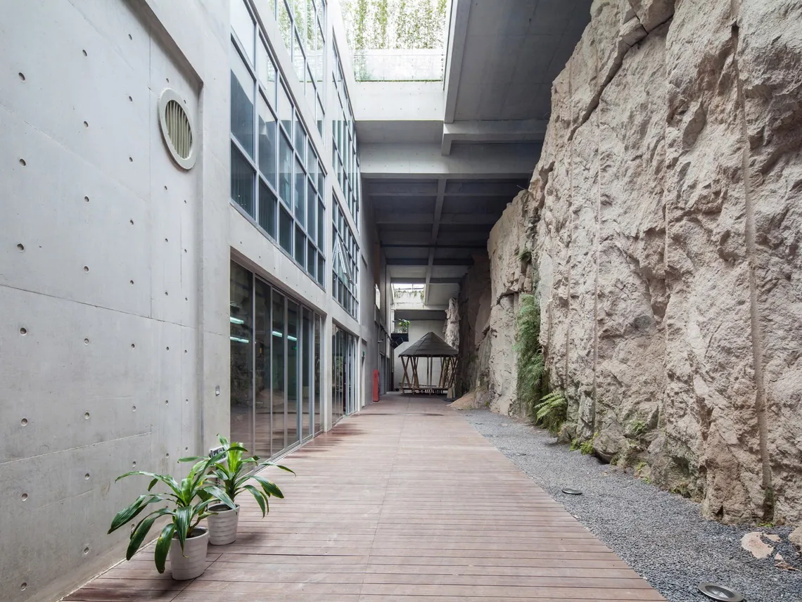 The Vanke Design Community is a sloping urban park of fair-faced concrete, glass and steel offices with grassy green roofs. Along its eastern edge, FCHA has transformed a pair of sunken plots into a multi-level complex of coworking, conference and exhibition spaces, individual offices, a lecture hall and a makers’ workshop. “Under the guidance of the landscape and urban design,” say the architects, “the project connects the ground floor and basement floor through large green slopes.”