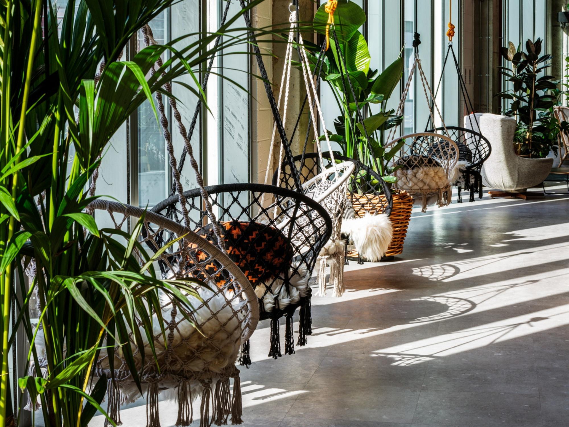 A striking space featuring a mix of geometric design, natural woods and biophilia, dark lines and bright color