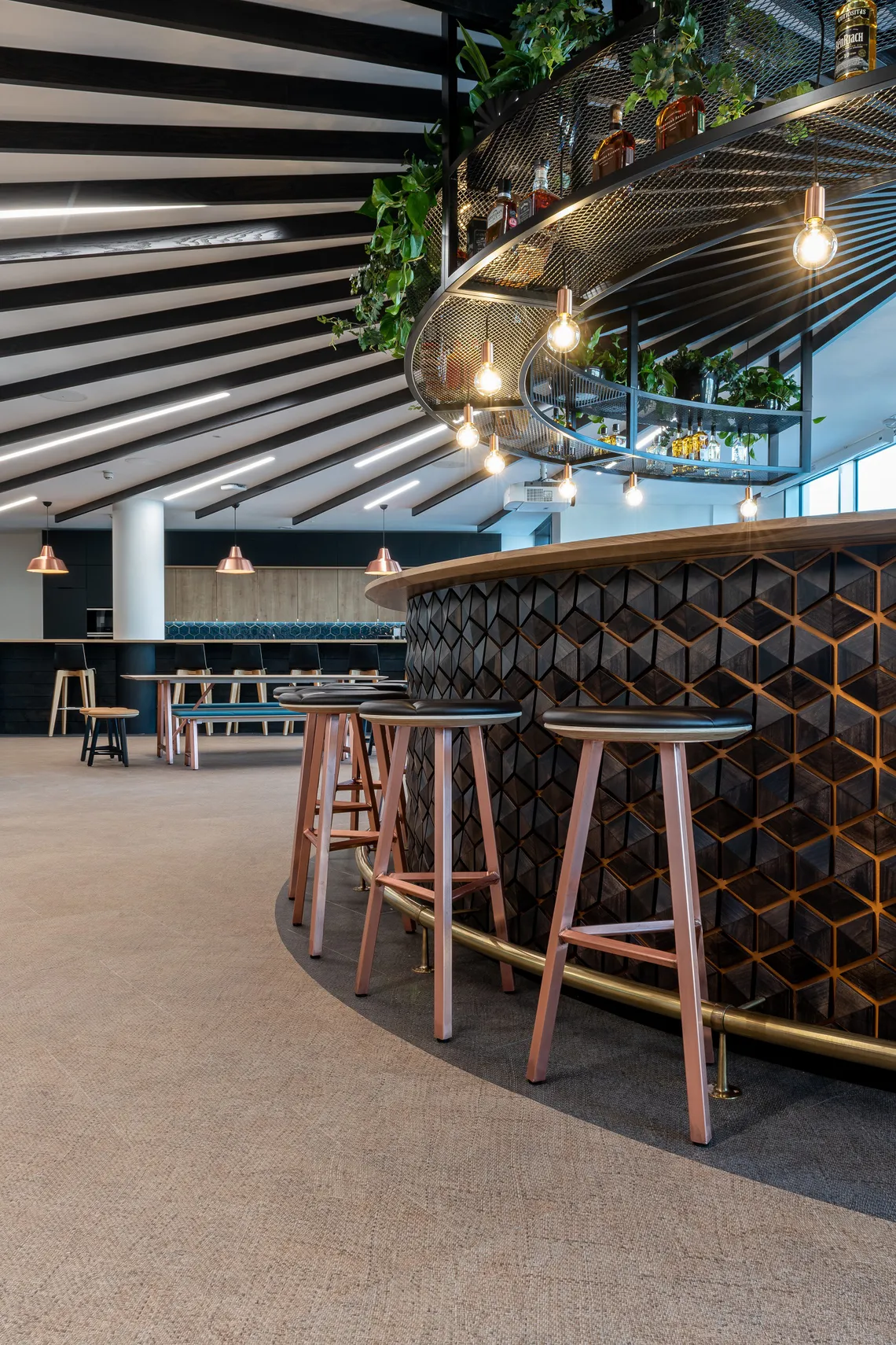 Tasked with designing the contemporary space, Woodalls created a plan to re-energise the facility and refocus the business around its family beliefs and values. The design, which infuses Brown-Forman's rich history into the space, focusses on warm wooden textures and finishes, large graphics and collaboration. From a sun-dial-like display of charred oak ceiling panels around the bar, to industrial style brass light fittings, every detail of this workplace reflects Brown-Forman's real home: the distilleries of Kentucky. Hunters were appointed to provide the furniture package and we worked with them to provide several pieces from our range.
