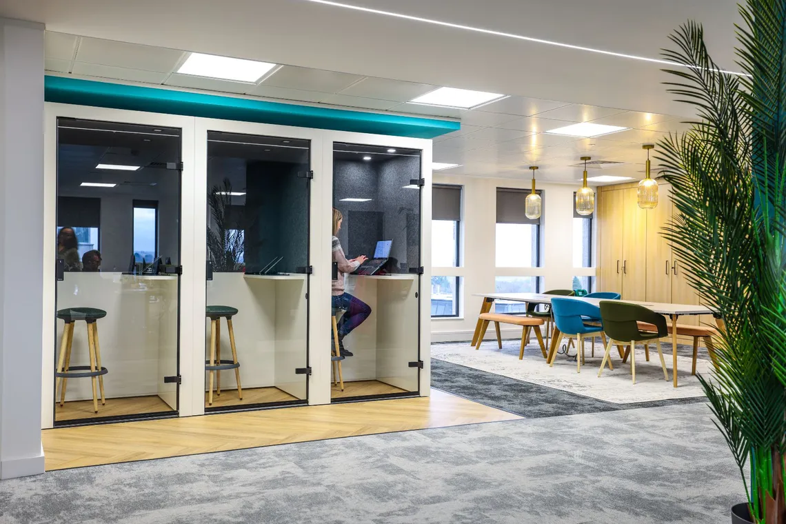 Portico, Spacestor’s acoustic pod which benefits from the learnings of years of curating the best user experience, was provided to give employees a quiet space to work. Seamlessly sleek, Portico’s efficient structure and clean look blends into the design, supporting the user with built-in power, ventilation, patented acoustics, and step-free access. The standing-height desk was chosen to accommodate both a high stool and standing position, whilst integrated PIR lighting helps to reduce energy consumption.