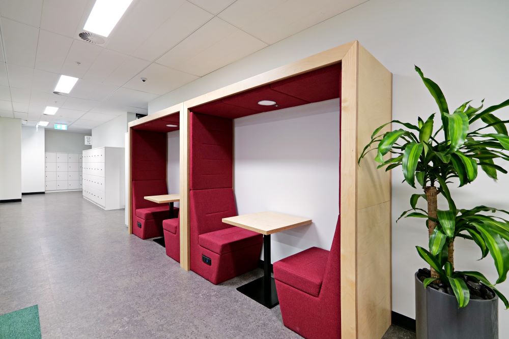 Recognizing the need for focused workspaces that remain connected to the overall office environment but provide some acoustic protection, Spacestor provided Portals Open. The single-user spaces are a quiet retreat for employees, affording the ability to concentrate whilst supported by integrated technology for an enhanced user experience. We also worked with Jacobs to provide a custom Portals solution which features double-width in-built seats, ideal for impromptu catchups or one-on-one meetings in a more private setting.