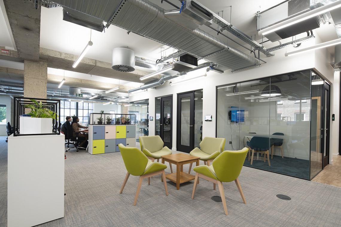 The reception is a warmly industrial opening with a breakout and café space. Exposed concrete ceilings, oak flooring, and organic features, create a resi-mercial, light vibe. HotLockers in soft pastels and lime green, offer a storage solution for employees, somewhere to put the belongings which would have normally inhabited a permanent desk. Additional Storagewall units were provided, including a TV alcove allowing for the integration of tech for a more modern and cutting-edge employee experience.