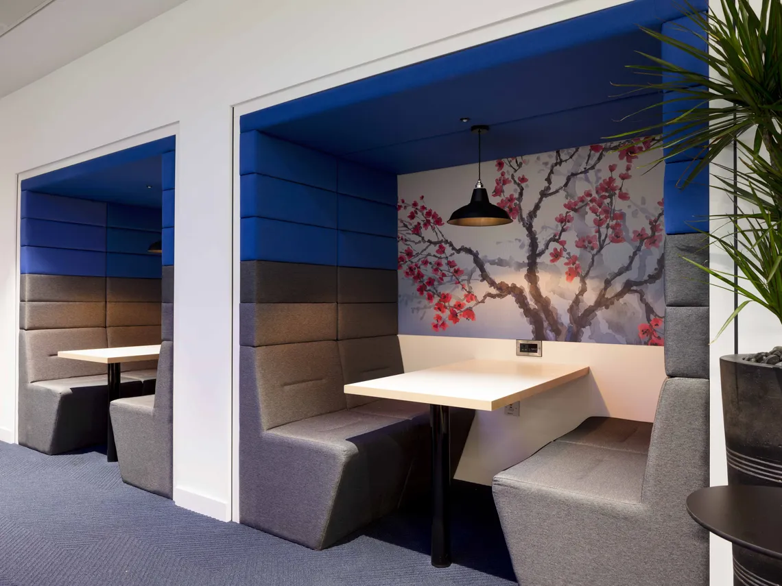 En réponse, Blue jelly a installé d'imenses écrans intelligents 853, une cloison escamotable électrique, un dôme de lumière virtuel qui recrée les différents ciels de différents territoires et en-dessous, grâce à Spacestor, une paire de postes de réunion Railway carriage intégrés avec l'assise revêtue en gris et le plafond en bleu ciel. De plus, en rappel de l'héritage japonais de la société, nous avons décoré le panneau arrière de chaque Carriage avec un imprimé de fleurs de cerisier. Regardez à votre gauche et vous admirez un ciel virtuel, regardez à votre droite et vous vous retrouvez dans un festival "Hanani" de fleurs de cerisier, juste ici à Windsor.