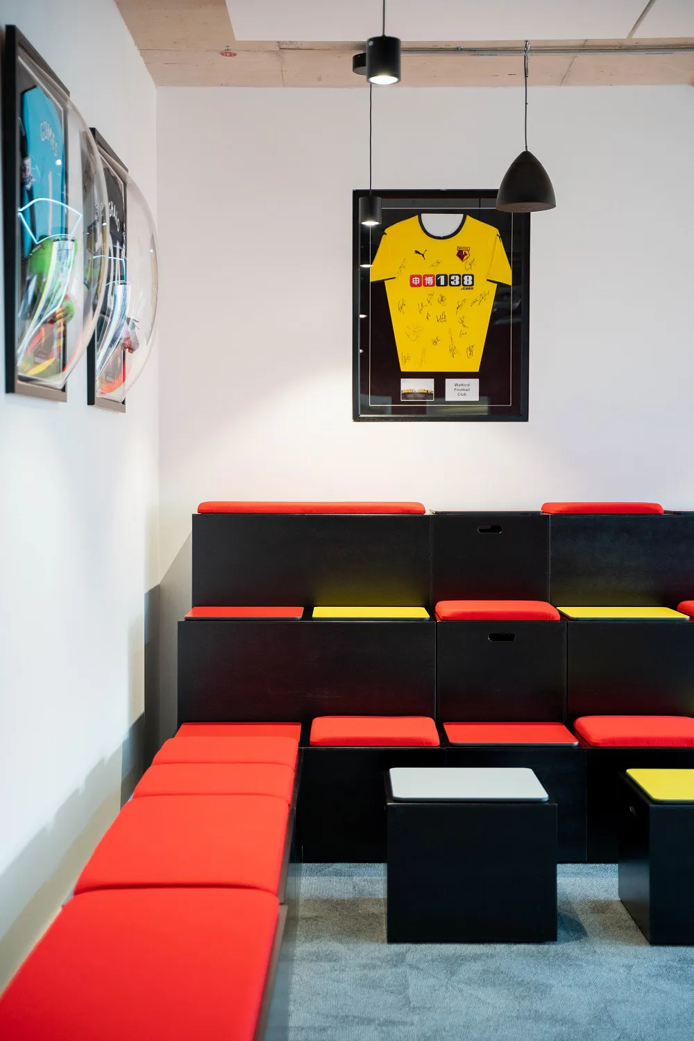 At every turn, the graphics, colours, signage and furniture creates an immersive brand experience and give an insight in the rich history of SI Games. The knowledge workers of today are constantly innovating, and the workspace design around them needs to accommodate their needs by providing stimulating environments that generate creativity. Bleachers are perfect for providing these chance collaborations, bridging the gap between a meeting room and an auditorium-style space. With their great flexibility, employees can instantly create the desired environment for any interaction, making a personal, informal space that will foster a flow of inspiration and new ideas. Drawing on their gaming heritage, our 'Bleachers' have been customized in a black stain finish, with red and yellow seatpads and footplates to echo the colours of Watford FC.