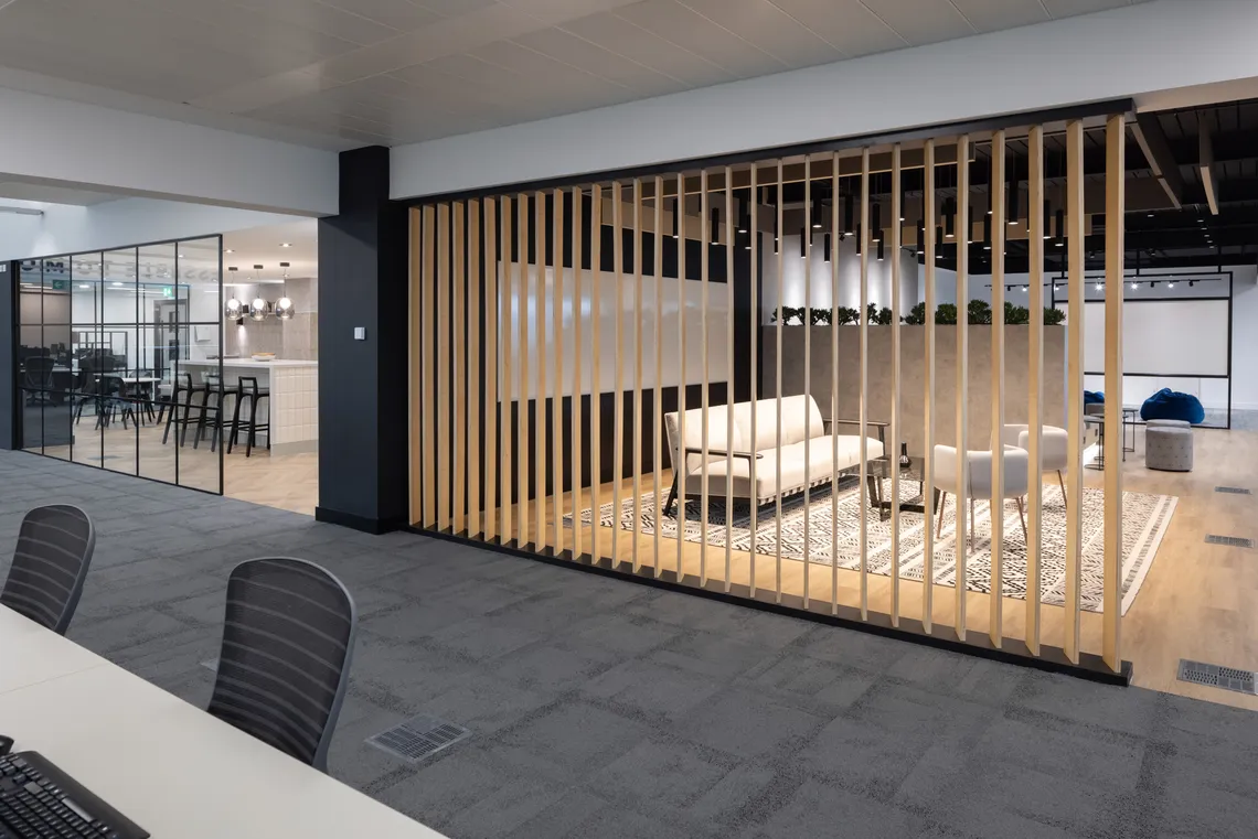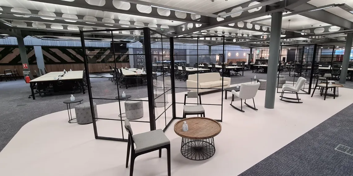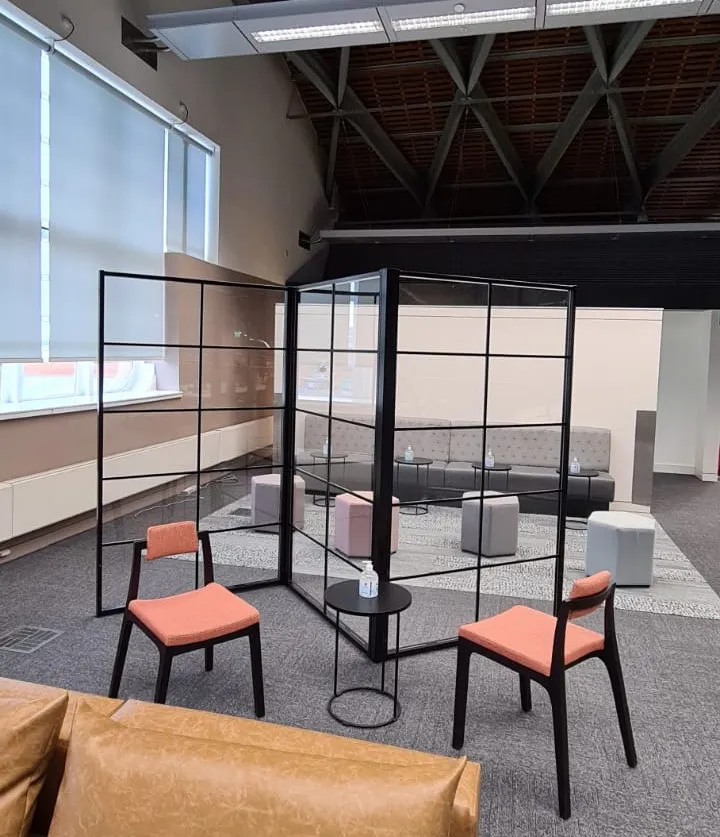 The design of the aircraft hangar, creates the perfect open plan office environment, and is filled with a plethora of break-out and collaboration spaces. The industrial feel is reflected in the furnishings with polished concrete, sleek oak floors, minimalistic lighting and black mid-century crittal style design motifs. Used throughout the space, our Palisades provides the perfect screening solution, to meet the needs of the post-covid workplace, thoughtfully and aesthetically. It makes use of clear panelling to re-enable the human connection with visibility, whilst giving teams the reassurance they need to get back together again safely. Palisades also anticipates the evolving and constantly changing workplace, and it's built-in flexibility means that Very could repurpose their screens into freestanding or other mobile screens at a later date.