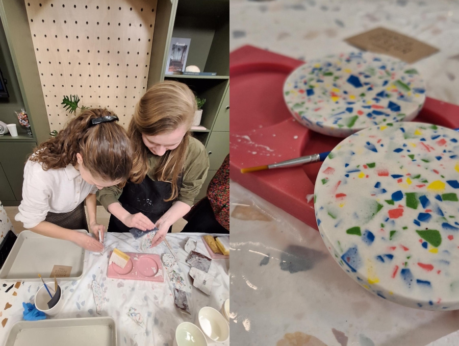 Expertly led by Manzo Design London, the workshop guided guests through the entire process of creating terrazzo, using a sustainable material called jesmonite. Tactile, immersive, and unique, the experience was an insight into the world of textures and materials, learning more about the ancient, Venetian-based surface which was originally born when mosaic workers put discarded pieces of marble to good use!