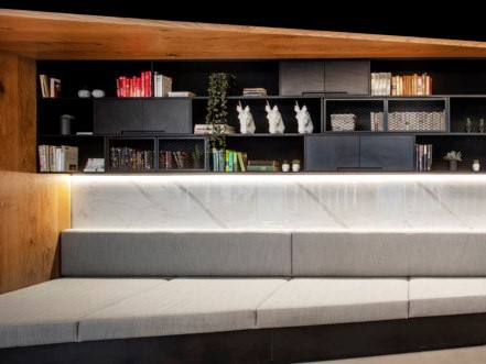 The corner office with the best view was dedicated to informal meetings. It features an elegant seating area nested in a wooden coated corner, to allow meetings to conduct in a more relaxed and intimate fashion.