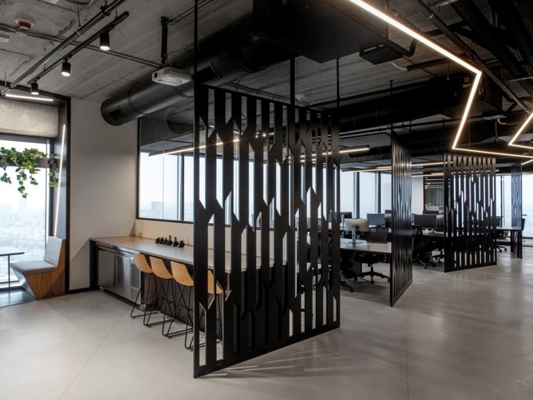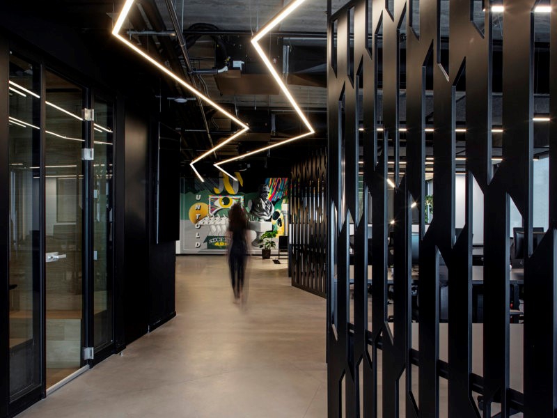The kitchen includes a long decorative library and a vass sofa for the employees to chill on. The company’s main conference room design was inspired by the “Lightsaber” sword from the famous Star Wars movie. The conference room also includes wooden tribunes that climb the walls, for those meetings that require a few extra seats.