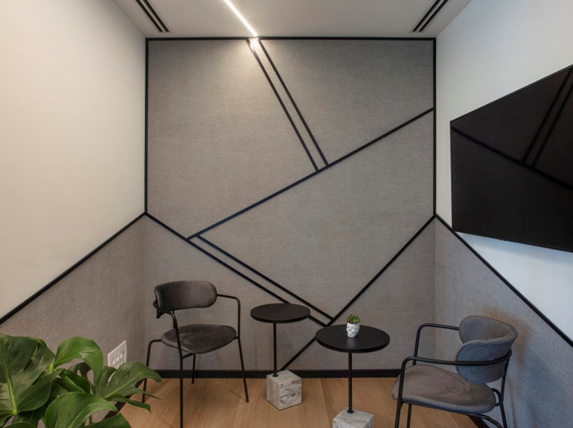 The main entrance to the office will lead you to the lounge and dining area. A giant wall art painting defines the lounge space, while a black frame defines the diagonal diners, situated alongside a plantation filled window. A long twisting hall will take you through the office facilities, while black perforated partitions situated diagonally separate the public area from the more private working area.