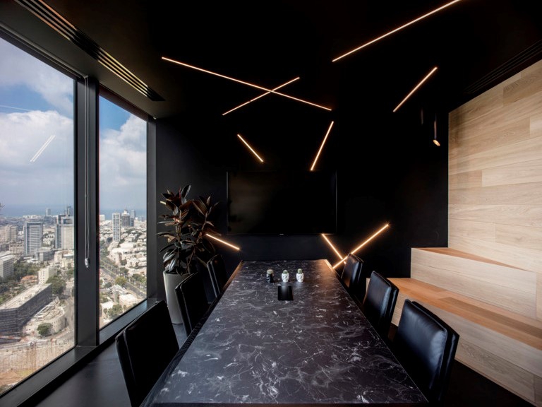 The young and ambitious Hi-Tech company, Arpeely, was interested in a design that would reflect their dynamic and energetic style. The diagonal design of the office was driven by the existing layout, which revealed a slanted wall and beam. The motif was entwined throughout the entire planning process – the division of space, the floors and ceilings, carpentry and the lighting.