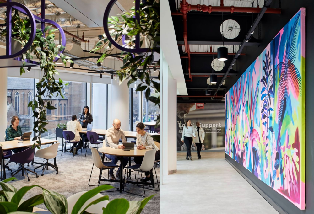 Throughout the BREEAM Excellent rated workspace, tp bennett has designed floor layouts to maximise natural light and views out across the city, as well as integrating plenty of planting. In the marketplace, a double height ‘grab-and-go’ catering area, tp bennett has incorporated a large green wall. Local Midlands-based artist Tim Fowler also created two large artworks for the upper floors injecting colour and vibrancy into the atrium in what he described as “creating a neon technicolour greenhouse garden”.