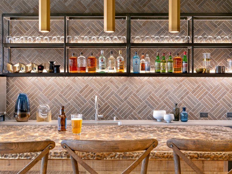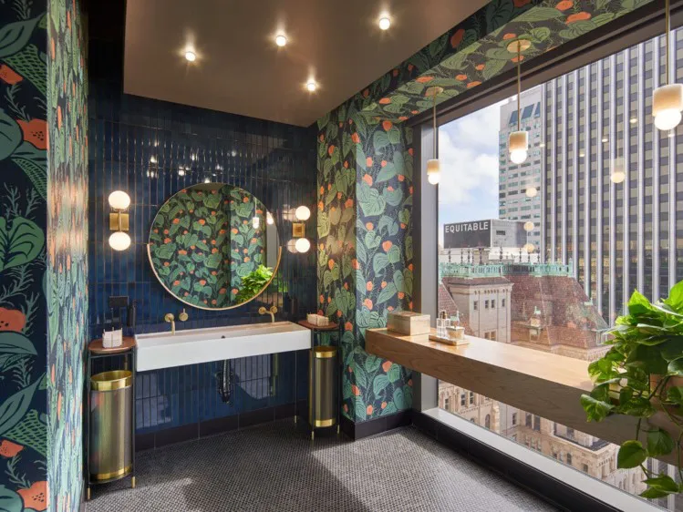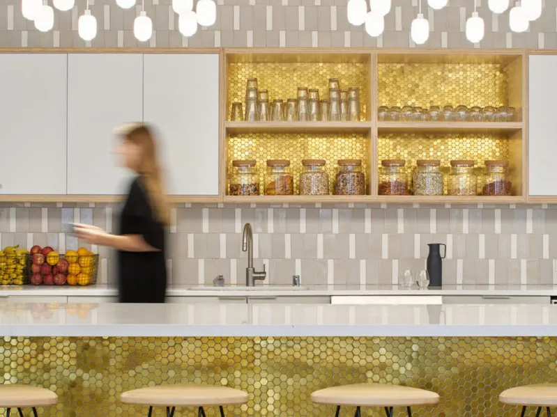 The headquarters has several amenities including a multi-function lunch space, a yoga lounge, a library for quiet time, and phone booths for private conversation. A 'jazz bar' destination space has been inspired by Charlie "Bird" Parker and jazz. It represents a forest at night, with dark and moody finishes and furnishings, including a service area with a hand-hammered aged brass island and coffee bar.