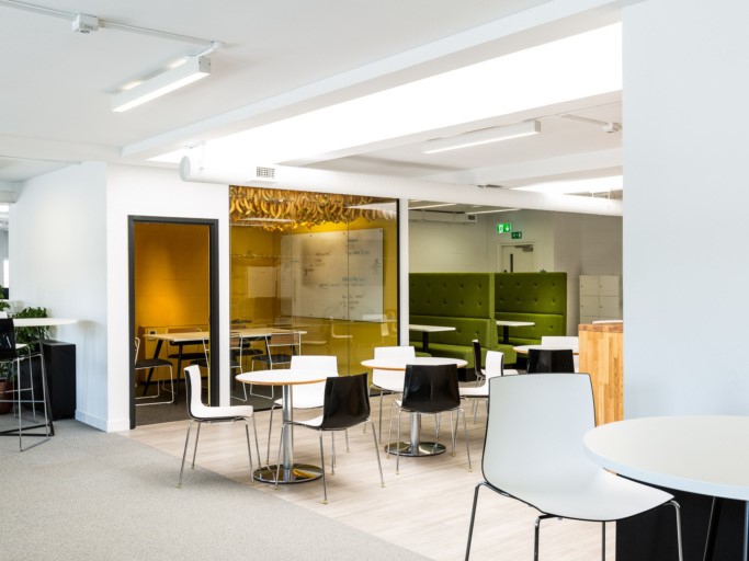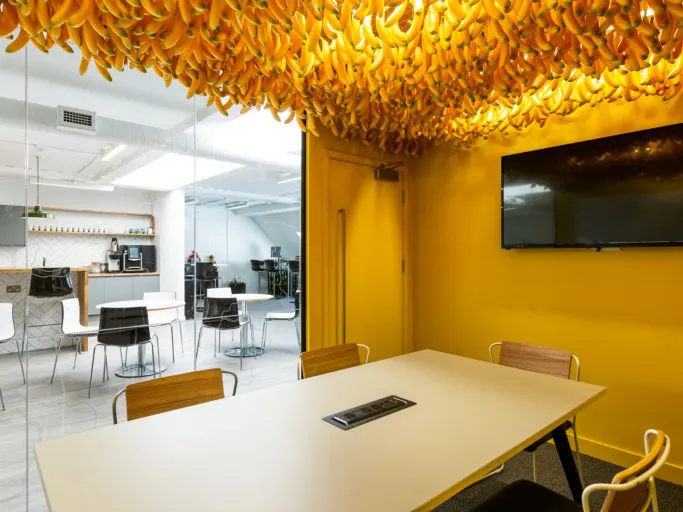 The space includes a variety of working areas, for both permanent and hot-desking space. 'Phone booth' meeting rooms support quiet working or phonecalls, and a large breakout kitchen area provides an area for staff to be refreshed. Perhaps one of the most unique parts of this project is the bright yelow meeting room with its sensational hanging banana ceiling - providing a bold splash of colour to the space as well as a stark acknowledgement of the work that Fairtrade does.