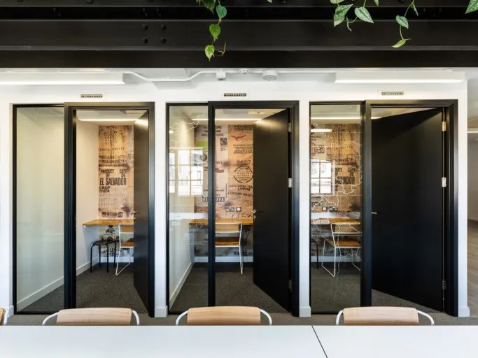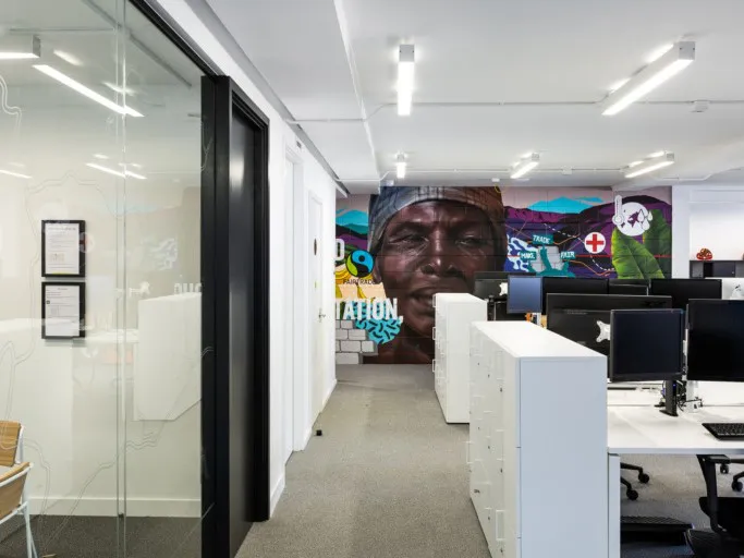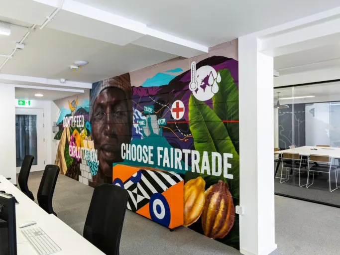 A bespoke graffiti mural in the workstation areas brings to life Fairtrade's brand messaging - that consumers have the power in their choices to make a difference every day. Just by their shopping choices, they can get farmers a better deal and help them to lead the dignified life everyone deserves. Meeting rooms feature bespoke wallpaper created by taking prints of authentic coffee sacks and glass partitions are detailed with geographical themed illustrations to represent the worldwide relationships that Fairtrade has formed.