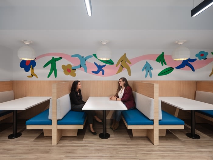 The first workplace VDTA designed for Glassdoor, in Chicago, relied on the company’s three main brand colors; this new office added teal. For San Francisco, the team opened up the palette to 15, referencing the city’s colorful personality and the headquarters’ role as a global hub for the firm. Wall graphics and abstract art installations express the company’s four core values—“transparency,” “innovation,” “good people,” and “grit.” Because Glassdoor greatly values its employee resource groups—internal advocacy organizations that work to grow equity and inclusion—the design team created an art installation that displays logos for each group, printed on wood.