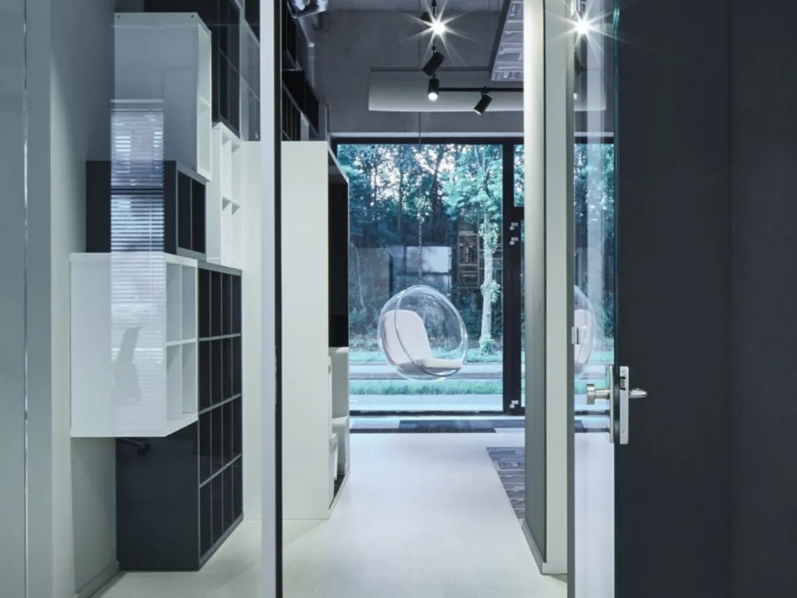 Bookstores now need to respond more than ever to the rapidly changing needs in the market. The concept for this bookstore is much more focused on being a meeting place, a flexspace where one can work, meet and acquire knowedge between the 'empty' bookshelves in an attractive space. Work and consultation places on large tables have been positioned centrally in the room and some double coupe-like seating areas integrated into the cabinet walls. Eyecatching bubble chairs have been used in the window, emphasizing the open and flexible use of the workspace. Cabinets with different dimensions in black and white have been mounted as a sculptural 'skyline' on the wall.