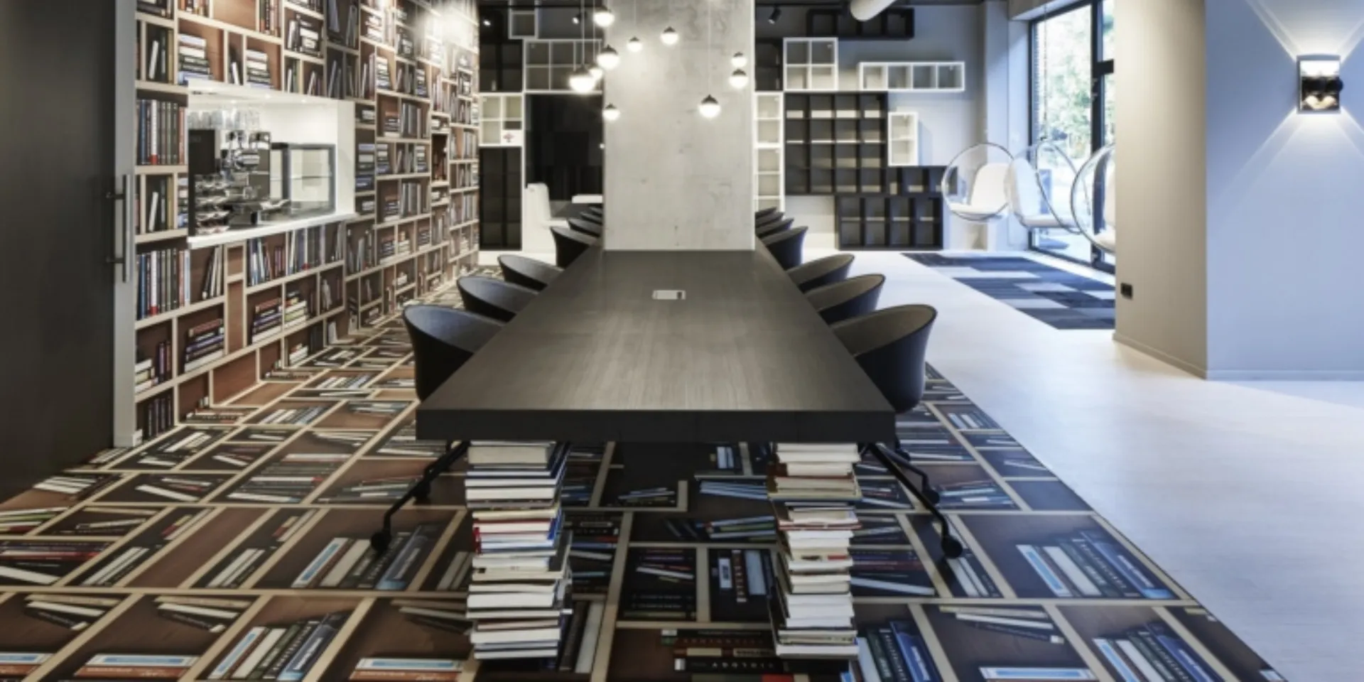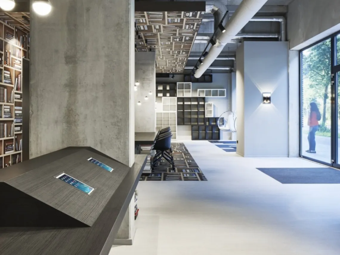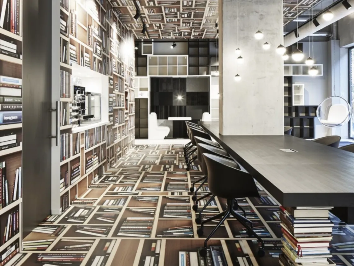 Because the book world of adventure, knowledge and science is not black and white, a photo print of a huge colourful bookcase has been used to cover the floor, wall and ceiling - the only colour accent in the space. The bookstore and office are separated by a facility unit where the kitchen, toilets and engineering rooms are housed. A special food concept based on healthy, sustainable food with specialities from all over the world is embraced, enabling people to work in the bookstore, have a healthy lunch or book it for a meeting.