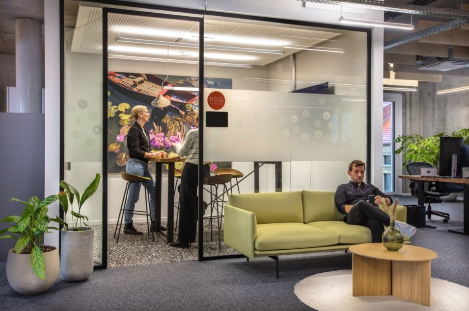 The design solutions included custom built furniture out of wood and black metal workstations and meeting tables with an industrial feel, creating a distinct concept that is inspired by modern New York City Lofts. Special attention to small details, such as carpet inserts in selected meeting rooms, showcase the high quality of the space. Roughly 80% percent of furniture was preserved including 145 existing plants that enliven the space and enhance the overall wellbeing. In addition, the office is fully accessible and includes various amenity spaces such as a wellness room for massage sessions and a co-working area.
