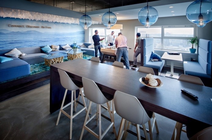 Evolution Design have succeeded in using colour to create empowering breakout areas – in the same space you have an oceanic view, dining table, secluded meeting pod and football table. The calming azure blue hues, known for their influential and productive connotations, allow this collaborative workspace to become multi-functional.