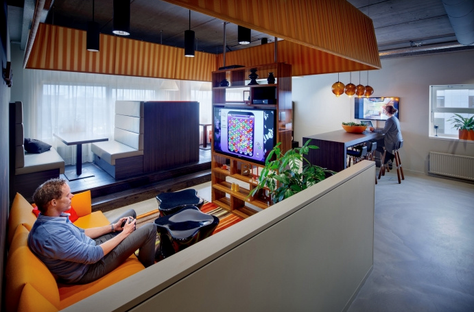 Out of the box thinking is what makes this workspace so attractive. The strict hierarchical layouts are gone; it is perfectly acceptable to have a games unit in the work lounge, complete with bright orange sofa and a mélange of suspended ceiling lamps.