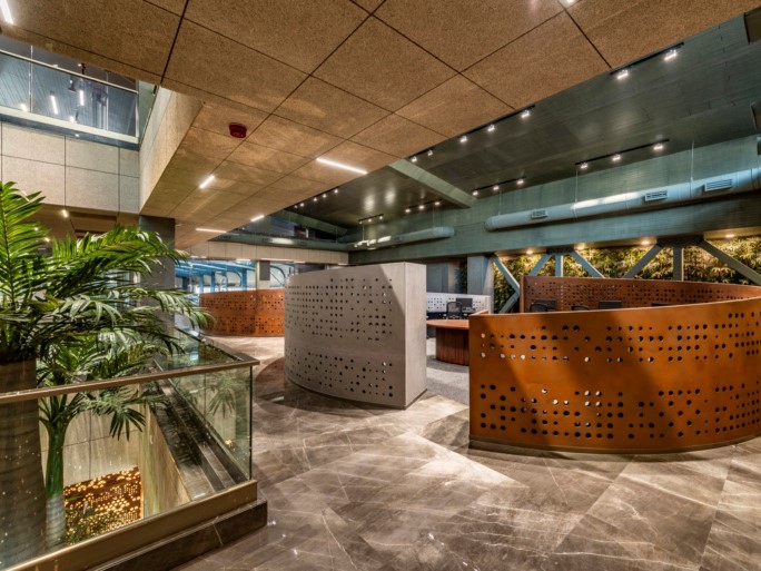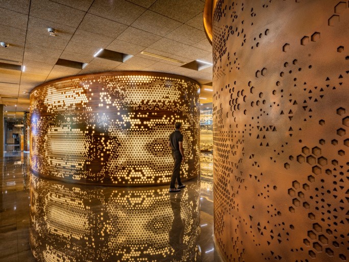 Lighting has been integrated into the design in multiple ways. Through perforated wood partitions, pyramidal ceilings and a conference room with an installation of light-infused aluminum pipes.