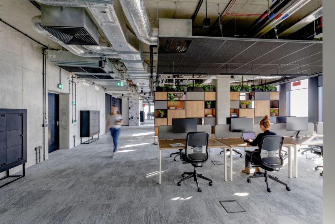 Individual office sections are separated by steel shelves filled with acoustic panels, wood, and greenery. These partition modules allude to the PwC logo. Desk reservation is resolved through a special application for employees. In the open space area, separate booths for solo or small group work were not provided. Instead, over a hundred acoustic booths were placed there.