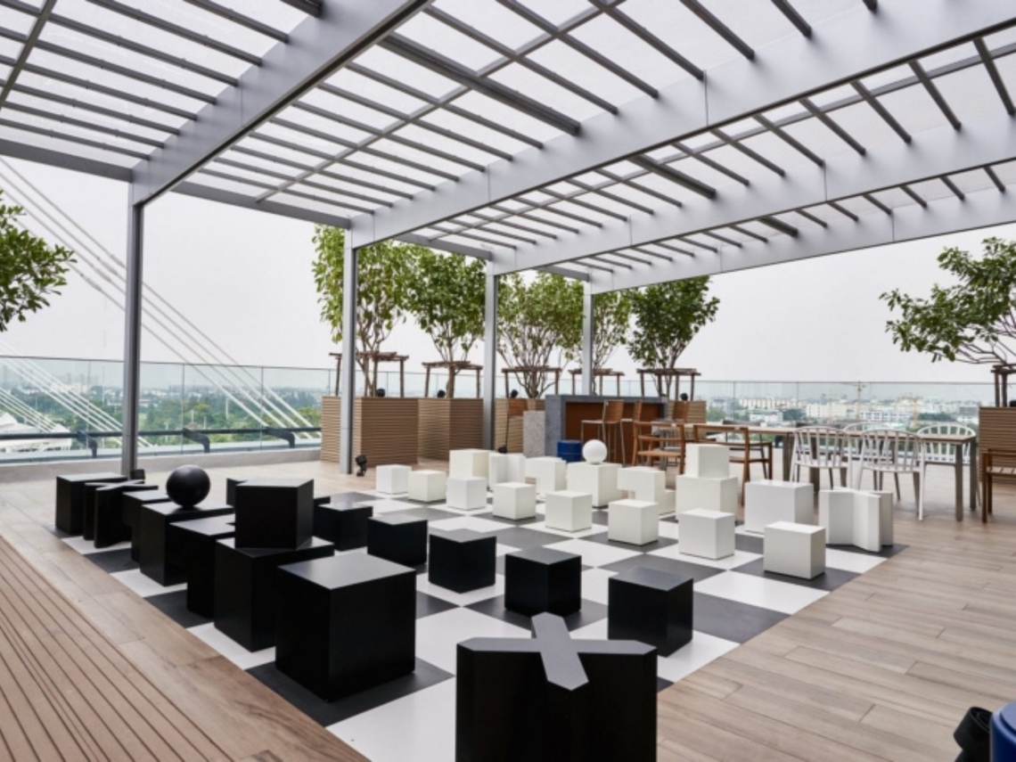 The design also reflected the SCB corporate culture, visuals and identity, bringing together the company colours in a creative, fun way throughout the office space, fitness areas, café and outdoor relaxation.