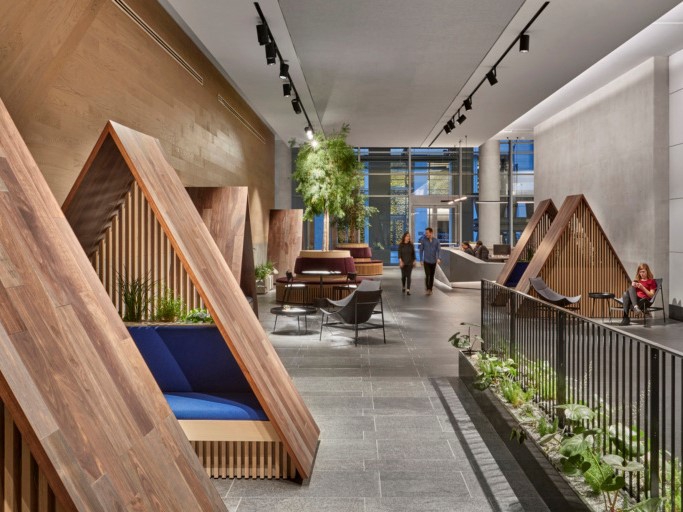 O+A chose a succession of finishes and palettes that suggest changing landscapes in order to replicate the distinct outdoor experience of the Pacific Crest Trail. For example, the second floor is inspired by baked earth colours and ubiquitous cacti to evoke the Baja desert, while Floor 5's library replicates the stillness of a mountain lake. This motif is sustained throughout the workspace's 10 floors, with inspiration taken from old growth forests, mountain streams, volcanoes and glaciers.