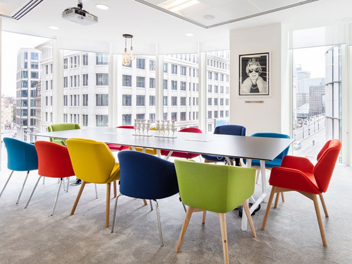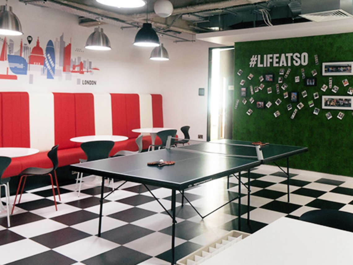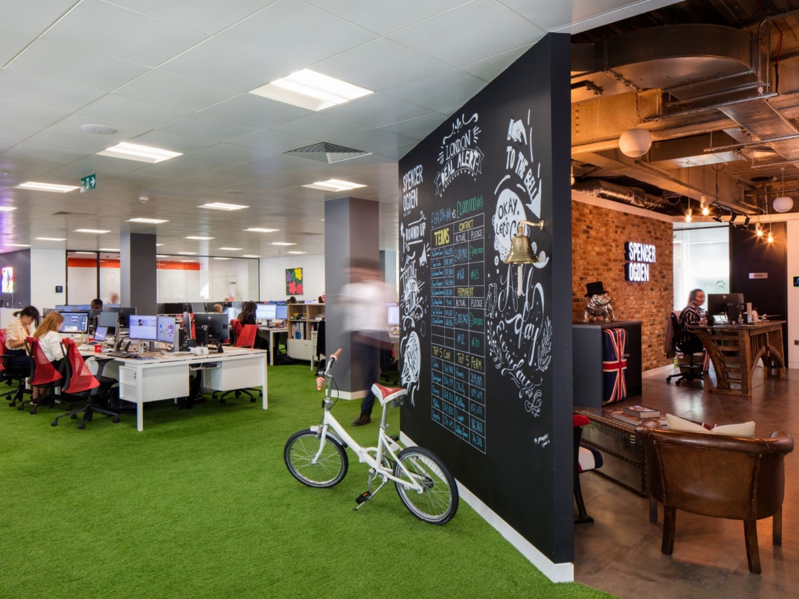 The London Headquarters of Spencer Ogden is an office that is known for its quirky style and overall functionality. It features a myriad of bold colours throughout, with patriotic red, white and blue, bare brick, bespoke office prints, red booths, a neon underground tube sign, games room, table tennis and much more.