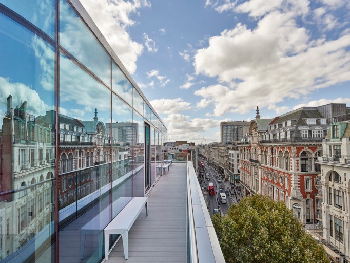 The restaurant on the sixth floor serves fresh food all day, doubling up as a event space for product launches, catwalks and brand events with innovative moving walls.. Huge floor to ceiling windows open out onto a tranquil terrace and vistas over Oxford street.