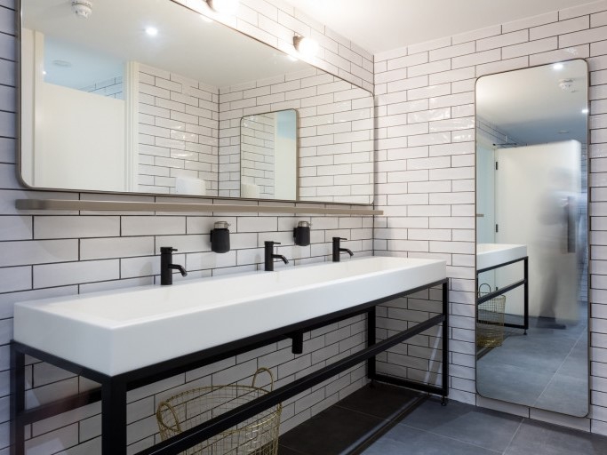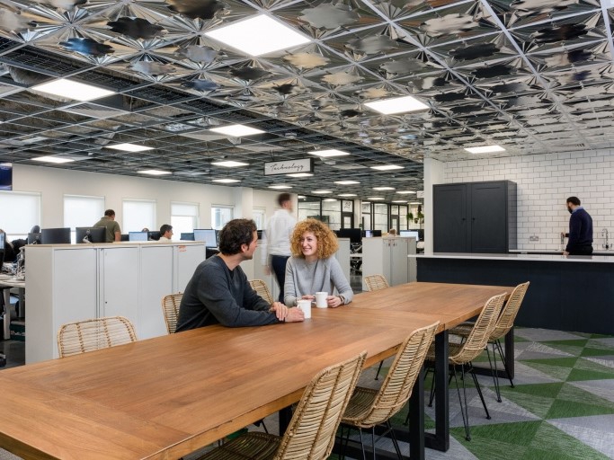 They were asked to create a Brooklyn Loft feel in a 1980s Canary Wharf office building. They began by stripping back the Cat A finishes; popping out the mineral fibre ceiling tiles but leaving the grid, pulling up the carpet tiles to expose the patinated access floor, and spraying the grid and tiles matte black in the cellular spaces. Then they layered a variety of finishes over this stripped back base to add color, texture and pattern. The project was completed from brief to build in only three months to the great satisfaction of staff and stakeholders alike.
