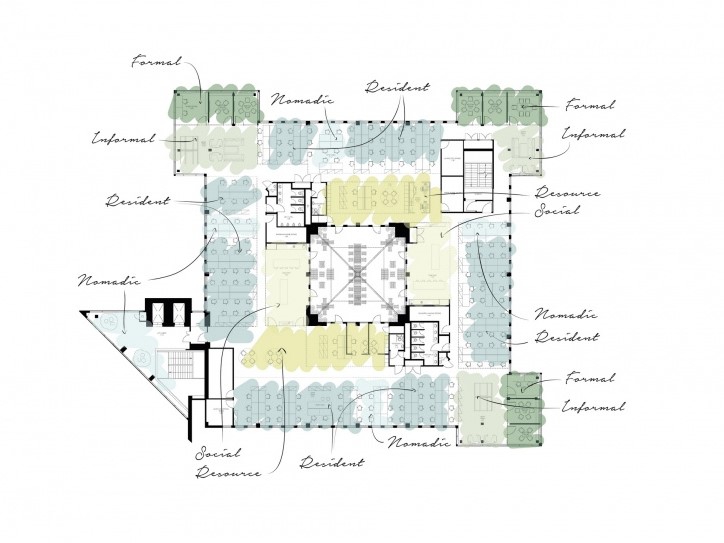 There are a multitude of work-settings to inspire and support various activities. Each of the 450 desks are only steps from one of the six unique coffee bars, and a mix of formal and informal meeting areas as well as heads-down quiet work zones. The first-floor features access to a 100 square meter atrium used for everything from town hall meetings to morning yoga classes and lunchtime cafe seating.